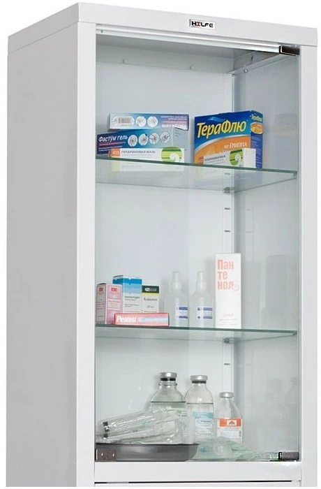 - В каждой секции медицинского шкафа имеются полки. Максимальная нагрузка – до 30 кг на металлическую полку и до 10 кг на стеклянную полку.