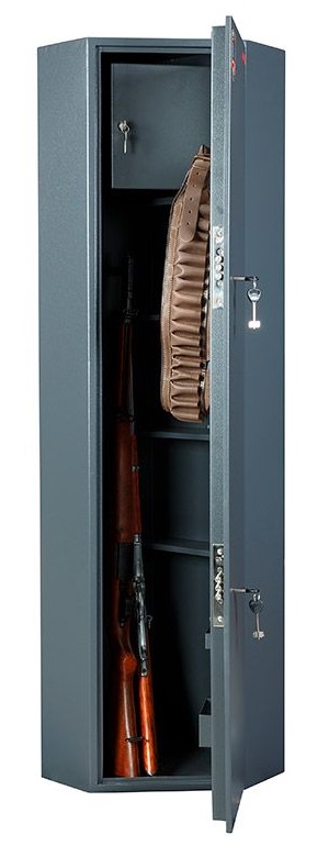 - В верхней части сейфа расположен трейзер (запирающееся на ключ отделение для патронов) размерами 288×361×86 мм. За узким трейзером остаётся свободное пространство, которое позволяет хранить ружья, по длине соответствующие высоте всего сейфа.