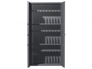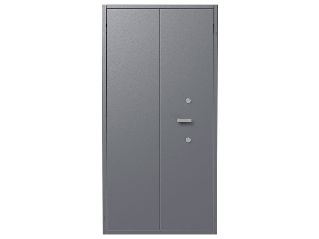 Сейф изготовлен в виде оружейного шкафа с двумя распашными дверцами. Снабжен двумя ключевыми замками и удобной поворотной ручкой, которая приводит в действие ригельную систему и запирает дверцы сейфа по трем сторонам. Корпус представляет собой сварную металлическую конструкцию, окрашенную порошковой краской нейтрального серого цвета (RAL 7024). Комплектуется 2 металлическими полками, которые образуют 3 яруса(вместе с основанием) для размещения 30 автоматов Калашникова - по 10 единиц на уровень. Каждый ярус оснащен карманами под шильды. Также на внутренней стороне дверей имеются 4 рамки для описи имущества.